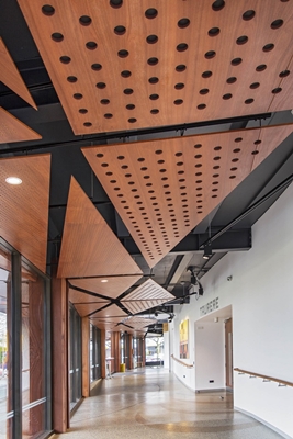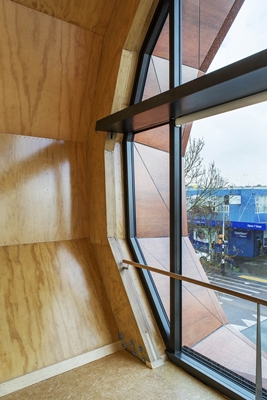 De driehoekige vlakken zijn van ALUCOBOND® en zien er uit als hout“, zegt architect Lindsay Mackie. „Iedereen die tegen het einde van het Modernisme is opgegroeid, heeft vooroordelen met betrekking tot de authenticiteit van de bekleding. Er bestaat een geraffineerd begrip om dit soort fenomeen te beschrijven: de buitenkant van het gebouw is skeuomorfisch. Skeuomorfische gebouwen zijn nieuw maar imiteren oude gebouwen, en skeuomorfisme betekent dat oude, vertrouwde eigenschappen in moderne objecten worden gerealiseerd.“