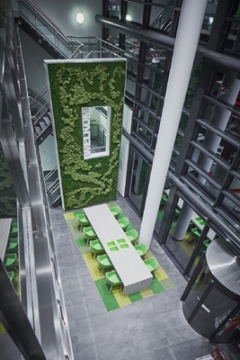 Voor het gebouw zijn de centrale gebieden ingericht met ontmoetingsplekken, een huiskamer met voorzieningen en de kantoorvleugels zijn voorzien van flex werkplekken.