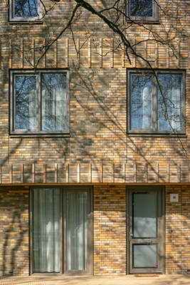 De rondom aanwezige platanen, met de geschubde bast en geelgroene bladeren, brengen hun geel-groen-grijs-bruine kleuren over op het geëngobeerde baksteen patroon in de gevels.