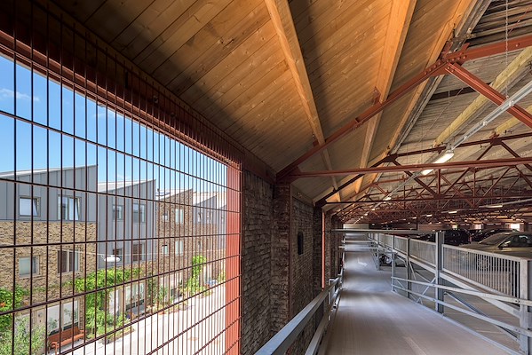Het industriële verleden komt tot uiting in het robuuste karakter van de parkeerloods en de no-nonsense houding in de aanpak van de renovatie. In de loods worden sleuven gezaagd, waardoor de parkeerloods natuurlijk geventileerd kan worden. Er zijn geen dure en energie verslindende installaties nodig. Daarnaast worden alle oude en ongebruikte openingen in de loods dichtgemetseld en in kleur gekeimd. Zo blijft het oude utilitaire karakter zichtbaar in de gerenoveerde loods. De bestaande gevels worden opgewaardeerd door begroeiing en een gedicht van noorderling Jan In ‘t Velt.