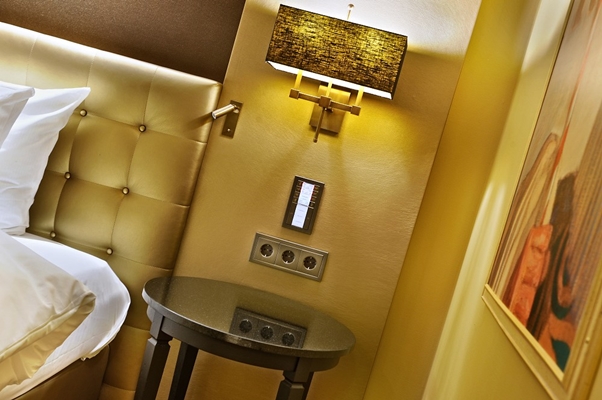 In de luxe kamers zijn JUNG KNX-tastermodules aangebracht in Messing klassiek. Hiermee kan de gast alle verlichting bedienen. Daarnaast hebben de luxe kamers een taster voor het service/meldsysteem. Bij een medisch noodgeval kunnen zij de betreffende taster indrukken, waarna een melding op het panel bij de receptie en op de portofoons verschijnt en de led op de gang rood gaat knipperen. Ook kunnen zij hierop aangeven dat zij wel of niet gestoord willen worden. Bij indrukken van de button “Do not disturb” verschijnt er een rood licht op de displayunit in de gang naast de kamerdeur. Het personeel ziet dan dat zij de kamer niet moeten schoonmaken. “Make up room” verloopt op vergelijkbare wijze, met een groene lamp buiten op de displayunit. Het onderste deel van de displayunit op de gang wordt gebruikt door het personeel voor hun ‘intelligente toegangssleutel’. De standaard kamers hebben conventionele bediening voor de verlichting, en KNX-tasters voor het service/meldsysteem. Deze units zijn uitgevoerd in LS 990 wit.
