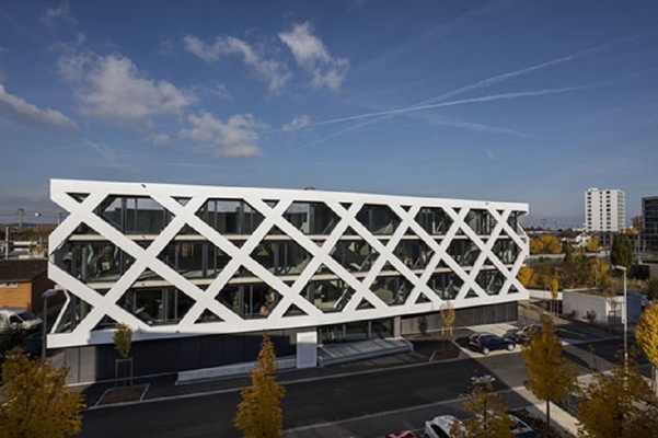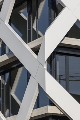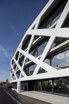 The commercial building by Adank & Partner Architects is situated near the central station in Kreuzlingen. At the restrained ground floor there are the entrance area and parking. Above there are three floors with freely divisible office spaces. Large window areas provide plenty of daylight. The curtain wall construction made of white ALUCOBOND