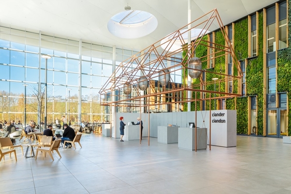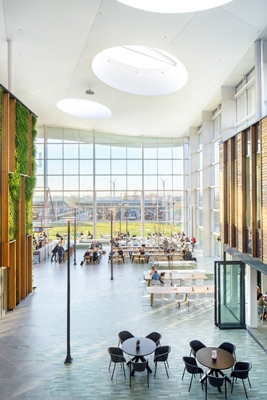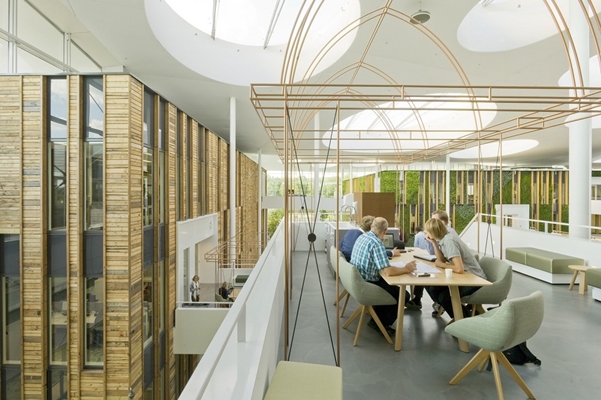 Verbinding staan daarom centraal in het interieurontwerp. De gebouwen zijn aan elkaar gekoppeld door een aantal loopbruggen. Door deze verkeersruimten vervolgens met programma ‘op te laden’ - koffiebar, lounges, (flex)werkplekken - wordt het publiek toegankelijke atrium bij uitstek een plek voor ontmoeting en kennisuitwisseling, tussen medewerkers en bezoekers.