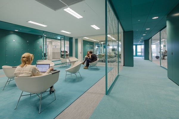 Vanuit hetzelfde lange termijnperspectief is ervoor gekozen om geen werkvloeren voor specifieke afdelingen te ontwerpen. In plaats daarvan zijn de verdiepingen ingericht naar type activiteit. In het ‘atelier’ komt men samen voor brainstormessies en overleg; clusters van sta-werkplekken - voor werk in teamverband – worden afgewisseld met ruimtes voor kort overleg. In de ‘bibliotheek’ vind je stilte en rust, in een besloten coupézitje of aan de lange bar langs het raam. Daarnaast zijn er ‘klassieke’ kantoorvloeren. Zo ontstaat een toekomstbestendig interieur dat zonder grote verbouwingen aangepast kan worden aan veranderende behoeften.