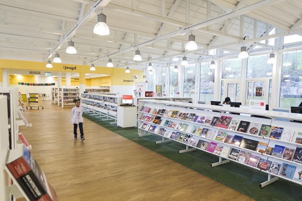 De collectie wordt op een heldere en aantrekkelijke wijze gepresenteerd. Voorin bevindt zich de volwassenencollectie, terwijl achterin de kinderafdeling is gesitueerd met voorleesplekken en een theater. De relatie met buiten wordt aangegaan door middel van leesplekken langs de ramen.