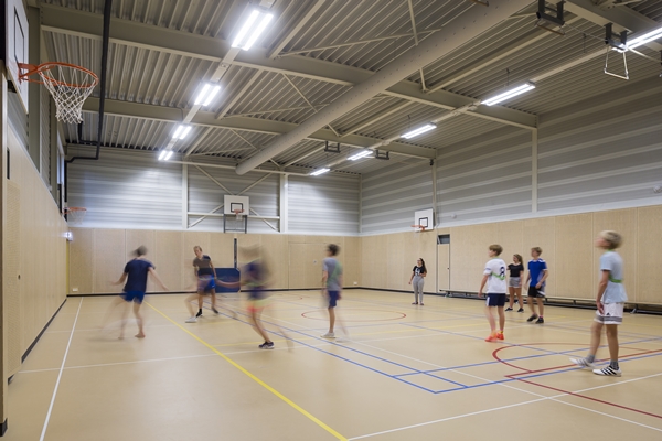 Het sportgebouw is ook ontworpen ‘vanuit het landschap’. Bij het ontwerp van dit gebouw is ervoor gekozen om de drie verschillende sportzalen om een monumentale boom heen te schakelen. De boom vertolkt zo een ware attractie bij binnenkomst van het sportgebouw dat is gematerialiseerd met warme en natuurlijke materialen. De architectonische verschijning laat zich kenmerken door de schakeling van ‘volumes’; de gymzalen vormen tezamen met de laagbouw met daarin de kleedlokalen een gevarieerd beeld van volumes met verschillende hoogtes. Om deze aaneenschakeling te verbinden is ervoor gekozen om de plint het bindende element te laten zijn, zowel qua materialisering als qua toepassing van glas.