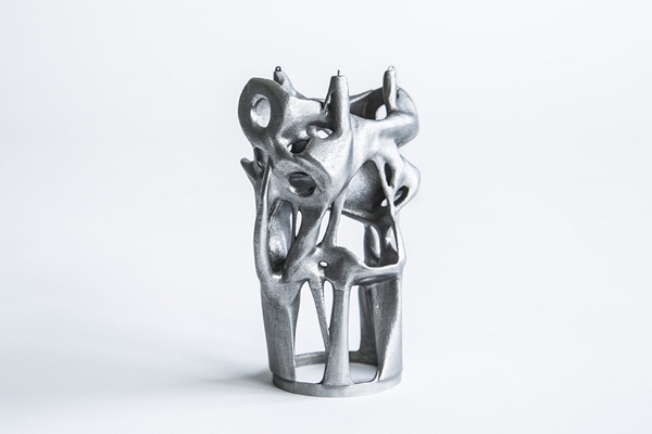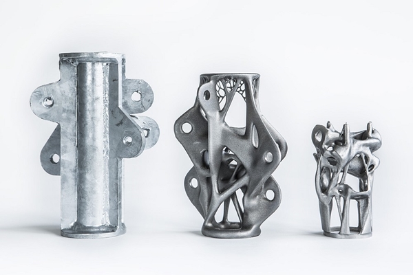 De drie getoonde constructieve elementen ('knopen') zijn allen ontworpen om dezelfde constructieve belasting en kracht op te nemen. Het verschil is dat het kleinste item rechts is ontworpen met behulp van Arup's meest recente optimalisatie- en ontwerpmethode voor AM.