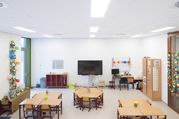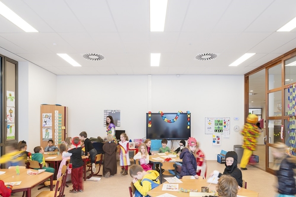 Marc van Vlierberghe, directeur van basisschool Sint Bavo en één van de gebruikers: “Alles in dit gebouw is een verbetering. We werken nu in grotere, hogere lokalen. En er is in het ontwerp veel glas gebruikt, zonder gordijnen. Alles is ruimer en meteen ook hygiënischer. Op de begane grond zijn de vloeren vlak en hard, zonder vloerbedekking. Toch waren de geluidniveaus en de akoestiek meteen al erg goed. Dat is mede te danken aan de plafonds.”