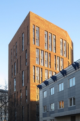 Naar buiten toe wordt het ontwerp bepaald door een façade vol textuur en reliëf, voorzien van de Hagemeister objectsortering „Burdenko“. Over het reliëf in de gevel, opgebouwd uit individueel uitkragende bakstenen, zegt Skuratov: „Deze techniek is in de Europese architectuur bekend. Het reliëf maakt de façade beleefbaar, verleent extra complexiteit en dichtheid, nodig om de competitie aan te kunnen met de historische systematiek van de omliggende architectuur.“ Ook de variatie in kleur van de roodbruine tot zandkleurige bakstenen draagt bij aan de levendigheid van het gebouw, zelfs in de grotere geveldelen.