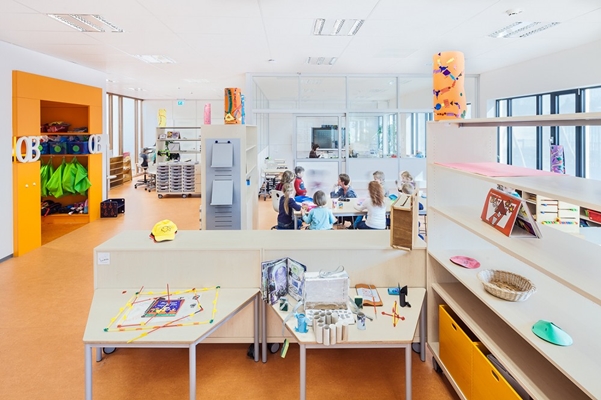 . Die zijn gerangschikt rond een gezamenlijk multifunctioneel deel dat letterlijk door iedereen gebruikt wordt en waar men ook gezamenlijk verantwoordelijk voor is. De gemeenschappelijke ruimte wordt gezien als een verlengde plek van de groep, waar kinderen naar toe gaan om te werken zodra de zelfstandigheid van kinderen dat toelaat. Centrale plaatsing van dat deel is noodzakelijk om eenvoudig, zonder dat het anderen stoort, vanuit de eigen basisruimte naar de gemeenschappelijke ruimte te kunnen gaan.”