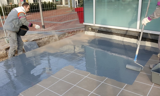 Maar hoe realiseer je een waterdicht oppervlak met de uitstraling van tegels? Door te kiezen voor het afdichtingsysteem van Triflex met een tegelmotief. Met het Triflex Creative Design worden accenten, zoals het tegelmotief geplaatst op het afdichtingsysteem. Hoofdbestanddeel van het systeem is een folie die op een voorbereide ondergrond wordt geplakt en qua kleur uitgewerkt wordt. Tenslotte wordt de folie verwijderd en wordt de gewenste vloer zichtbaar.