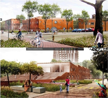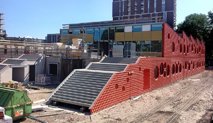 De voorheen zieltogende wijk Banne Buiksloot - deel uitmakend van het Amsterdamse stadsdeel Noord - zit in de weg omhoog. Dorus Rijkersschool heet de laatste aanwinst, een basisschool met Brede School-faciliteiten, waaronder een peuterspeelzaal en buitenschoolse opvang. En hoewel ze vaker scholen maken, is dit er geen van dertien in een dozijn, zegt Radboud Poortvliet, projectleider van Friso uit Sneek. “De school moet een soort hoogte van 5,20 m1 wegen ze per stuk een kleine 15 ton. Ze werden daarom ‘just in time geleverd’, zegt Poortvliet: “Er is aan die elementen veel werk besteed. De grote moeilijkheid waren de ronde kozijnsparingen van de binnen- en buitenbladen die exact tegenover elkaar moesten komen. Bovendien is geen element hetzelfde, dus kun je je voorstellen dat alles tot in detail is uitgezocht. Met resultaat, want het monteren verliep vlekkeloos.” Ook te danken aan het driedimensionaliseren van bestek en tekeningen. Poortvliet: “We zullen altijd proberen faalkosten waar mogelijk te vermijden. BIM is een daarvoor onmisbaar hulpmiddel.”