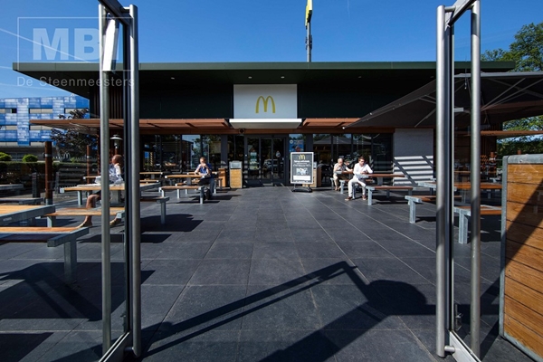 Dat het terras van Mc Donalds intensief gebruikt wordt behoeft geen uitleg. Dat de vestiging in Delft dit gegeven meewoog in de keuze voor de juiste terrastegel is een feit. Daarnaast moest de tegel niet misstaan naast de moderne, nieuwe vestiging. De aannemer wist te overtuigen met GeoCeramica