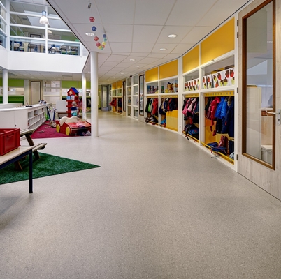 In overleg met de architect heeft de school verschillende dessins geselecteerd. Zo is een plankendessin gekozen voor een huiselijke uitstraling in het kinderdagverbijf. In de schoollokalen ligt Acczent Excellence 80 in een fijn streepdessin en in de vergaderruimtes is een breder streeppatroon toegepast.
