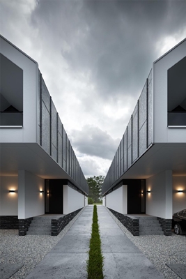 Daarom is er gekozen voor twee vrijstaande woningen met vrijwel gesloten wanden naar elkaar toe. De ruimte tussen de woningen is slechts 2,5 meter, dit, om zo’ n groot mogelijke groene zone met licht aan de open kant van de woningen te behouden. Die ruimte tussen de woningen vormt een as die eindigt in een vijver met fontein. De functie van de fontein is tweeërlei, ter bevestiging van de as en om eventueel geluid van de buren op te heffen. De open zijde van de woning geeft veel ruimte voor terras en tuin. De tuin eindigt in bos.