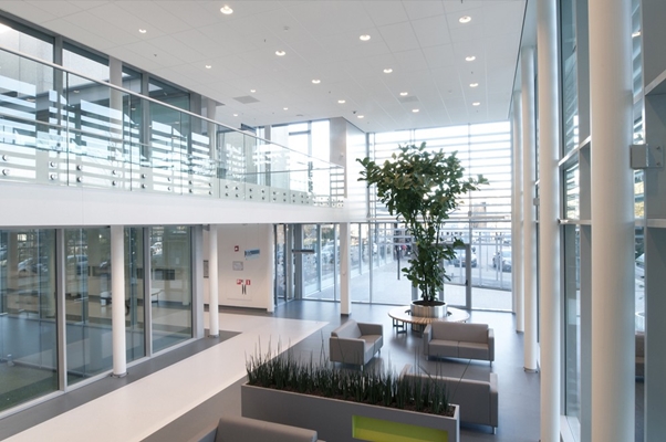 Lichtval in de kern van het gebouw draagt mee aan een prettige en open leefomgeving. Rondom het atrium worden mensen gastvrij ontvangen en er is een keuze vrijheid van zitten. Men kan kiezen uit een comfortabele bank, aan een grote leestafel of een zogenaamde treinzit met caféopstelling. De huiselijke inrichting en open uitstraling van de ontvangstgebieden sluiten naadloos aan op de structuur van het gebouw.