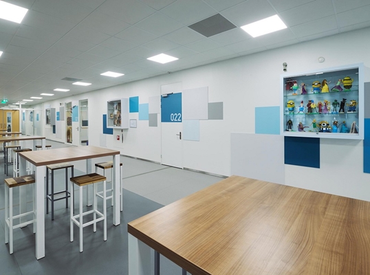 In het ontwerp hebben we de veelkleurige schittering van het water vertaalt naar een pixelpatroon op de wanden, waarbij de verschillende vleugels en verdiepingen ieder hun eigen kleur hebben gekregen. Deze vlakken lopen door in de lokalen. Aan de overzijde van de gang is een kleurstrook in de vloer en op de wanden geplaatst, die doorloopt in de lokalen en waarop in de gang studiebankjes geplaatst zijn. In de kantine is een golvende bank geplaatst waarin alle kleuren samenkomen. De veelkleurigheid maakt van de school een herkenbare en dynamische leeromgeving.