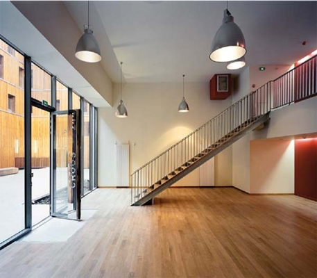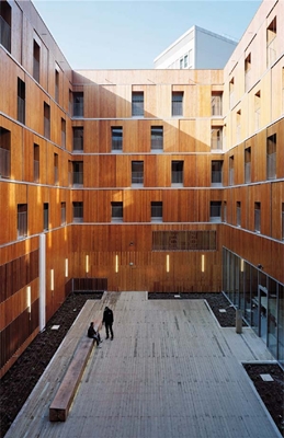 façade. The outer skin’s smooth material is continued in the swivel-mounted window shutters, making the building’s modernity apparent even when viewed from the exterior. On entering the spacious entrance hall, greenery in the internal courtyard is revealed. The inner façade is clad with larch and communicates a hospitable, friendly ambience which is very welcoming. The monumental wooden beam in the inner courtyard not only acts as seating. It is the symbolic link between the 202 student flats on one side and the 124 social flats for municipal employees on modest salaries on the other. The building’s innovative use goes hand in hand with the use of modern, sustainable materials and its unusual design enhances the surrounding area.