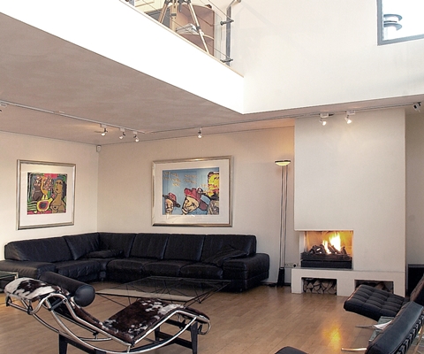 Penthouse in Scheveningen, geplaatst op twee oude pakhuizen en ontstaan door de toevallige ontmoeting van een ongelakte surfplank en een stalen lampje.