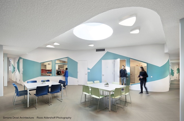 Simone Drost Architecture heeft een licht en prikkelarm interieur ontworpen. Er is bijvoorbeeld ruim aandacht besteed aan geluidsisolatie en akoestiek. Per lob heeft elk middengebied een eigen kleur en vorm, waarmee de diverse domeinen herkenbaar zijn. De ‘bewegende’ gekleurde vormen op de wanden nodigen weer uit om te volgen. “Gevoeligheid van deze doelgroep geldt ook voor sfeer”, vertelt Drost. “Na onderzoek hebben we twaalf soorten wit, naast vergrijsde kleuren toegepast.”