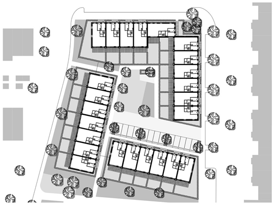 Robuuste hagen bepalen het beeld op de overgangen van openbaar en privé. Het landschapsontwerp van Buro Mien Ruys complementeert de woningen en benadrukt in eenvoud het groene karakter van het nieuwe hof in deze oude buurt.