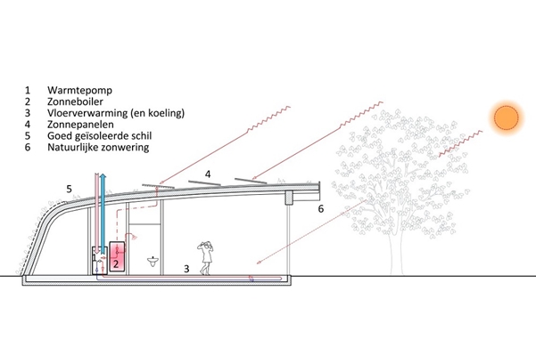 Het gebouw is bijna energieneutraal dankzij een uitstekend geïsoleerde schil. Verwarmen en koelen gebeurd middels een all-electric installatie met een warmtepomp en een zonneboiler.