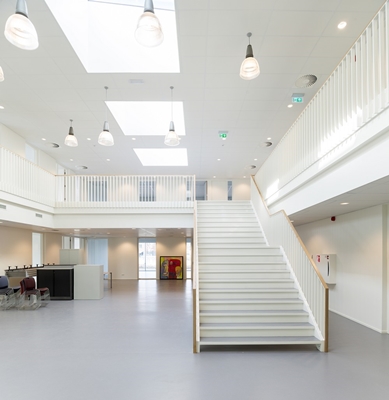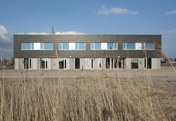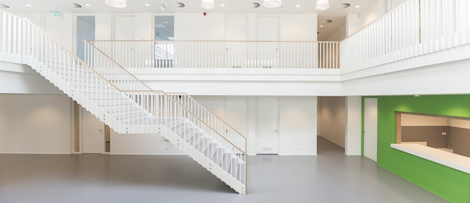 De plint bestaat uit glas en decoratieve betonnen gevelelementen met daarboven een donkere zinken gevelbekleding. Vormtaal en materiaalgebruik zijn voor ieder van de gebouwdelen gelijk waardoor esthetisch één coherent gebouw is ontworpen. De dragende gevelwanden zorgen ervoor dat de lichte binnenwanden aanpasbaar zijn wanneer gebruikerswensen veranderen. Ook is het in de toekomst mogelijk om het gebouw als één complex te gebruiken. De school is een Frisse School klasse B.