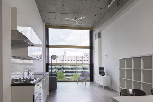 Dat gevoel wordt versterkt door de ramen die verticaal openen. “Alleen de penthouses hebben balkons, de lofts niet. Om toch een buitengevoel te creëren kan het middendeel van de ramen helemaal naar beneden geschoven worden. Het onderste deel dient dan als balustrade.”