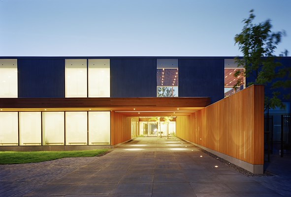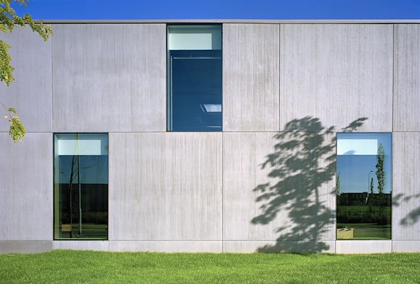 Een ritmische schakeling van betonpanelen bepaalt de architectuur van de gevel. Speciaal voor dit project is een innovatief aluminium kozijnsysteem ontwikkeld, met als resultaat een strakke aansluiting van glas op beton in hetzelfde vlak. In contrast met de vlakke strakke buitengevel zijn -als overgang naar het interieur- de gevels om de patio bekleed met geolied red cederhout. In de vorm van een luifel en een begeleidende wand treedt deze “warme” binnenwereld naar buiten.