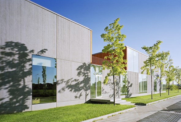 Een uitsnede in het volume genereert een overdekte entree, een patio en een dakterras dat aan de kantine grenst. De uitsnede zorgt tevens voor een bijzondere lichtinval en geeft het gebouw de benodigde privacy.