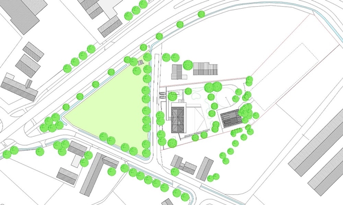 Karakteristiek voor de villa zijn twee geschakelde, subtiel gevouwen, zinken dakkappen, die samen met de eronder zwevende pergola binnen- en buitenruimte van het huis definiëren en qua belijning verankeren in de context. Gelijktijdig definieert een natuursteen terras vlonder de plek van het huis op het grondstuk, waarop een transparant, glazen en paviljoen-achtig volume onder de gevouwen, kap, de relatie van de woonlagen met de landschappelijke context mogelijk maakt en het licht tot diep in het huis laat treden. Middels verschuifbare, houten lamellenelementen, herinnerend aan de traditie van de Brabantse luiken kan het transparante paviljoen getransformeerd worden in een introvertere leefomgeving. Binnen de glazen gevelhuid circuleren de woon- en leefruimten vrij om een centrale, houten kern, waarin functies als toilet, garderobe, meterkast en de trap zijn ondergebracht. Op verdieping biedt onder het gevouwen dak, een galerij een introverte plek, die in visuele relatie staat met het woonniveau en tegelijk de mogelijkheid biedt zich terug te trekken. Via de centrale houten kern zijn verder de slaapvertrekken in het, op het noorden georiënteerde souterrain bereikbaar. Door middel van een riante glooiing in de tuin wordt het daglicht ook hier tot diep in het huis gehaald. De zichtrelatie met de houten paardenstal, die voor de karakteristieke eiken bomen, die de tuin scheiden van het erachter liggende weiland, gesitueerd is, karakteriseert de plek. Middels zijn eenvoud in vormgeving en materialisatie integreert de paardenstal zich in het ensemble.