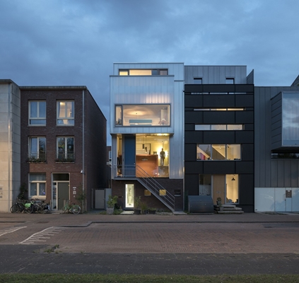 De gevel aan de tuinzijde is vrij gesloten. Door toepassing van het polycarbonaat in de gevels komt hier gefilterd licht in het interieur. Een uitzondering is de begane grond: De grote ramen in het hoge atelier laten ruim licht naar binnen vallen.