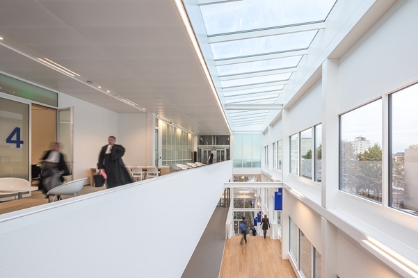 Het entreeportaal geeft toegang tot de ontvangstruimte met de portiersbalie. Een royale trappartij met daarboven een lichtstraat leidt langs de oostgevel naar de wachtruimten met aangrenzende zittingzalen op de tweede en derde etage. De wachtruimten zijn helder en functioneel gezoneerd en hebben een open en lichte atmosfeer. De zittingzalen hebben allure zonder luxe te zijn en kennen een hoge mate van rust, helderheid en daglichtontvangst. De achterwanden zijn gedecoreerd met fotokunstwerken door Marjan Teeuwen, die hiervoor sloopmateriaal van afgebroken gebouwen in bijna abstracte composities verwerkte. De zalen op de derde etage zijn dubbelhoog en voorzien van een publieke tribune.