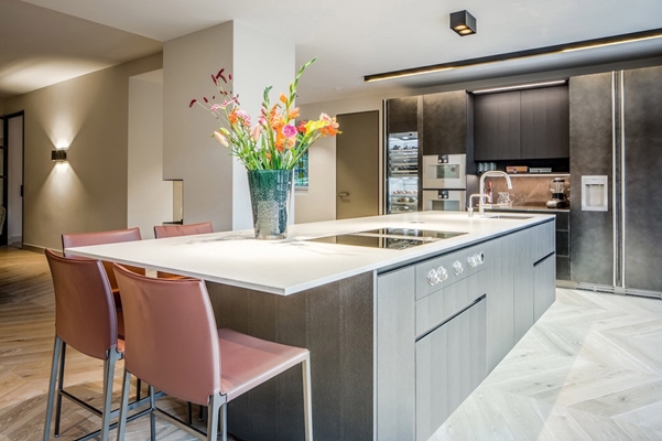 De kozijnloze Moon deuren zijn uitgevoerd in mat gelakt glas kleur palladio.