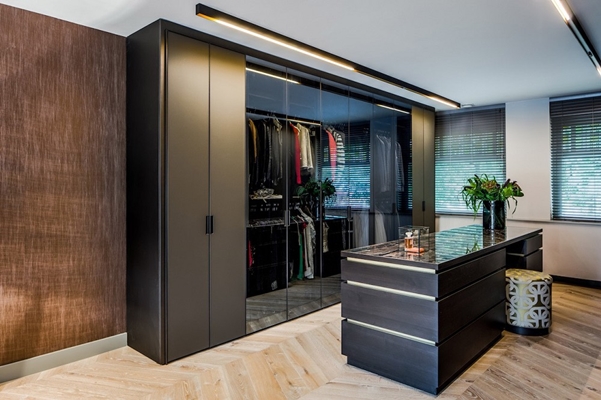 kast toegepast. De structuur en glazen deuren van deze kledingkast zijn uitgevoerd in mat gelakt caffé glas en reflecterend grijs transparant glas.