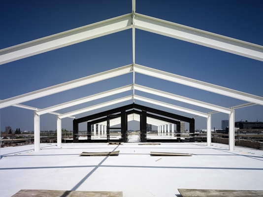 De verdiepingen hebben een vrije indeling, omdat dragende wanden afwezig zijn. Dezelfde flexibiliteit is terug te vinden in de plattegronden. Het bestaande dak moest door zijn slechte bouwkundige staat worden verwijderd. Hiervoor in de plaats is een nieuwe verdieping aangebracht, die het gebouw als een loods bekroont. In dit nieuwe daklandschap bevinden zich tien penthouses, waarvoor speciale grote glazen schuifpuien zijn ontwikkeld. Op de begane grond zijn de commerciële ruimtes ondergebracht, die door hun hoogte van 6 meter een imposante indruk maken. Achter de grote laaddeuren op de begane grond bevinden zich naar de kade openslaande glazen deuren. In verband met veiligheid en beheersing van het lichtniveau zijn stalen frames, gevuld met uit roestvast staal geweven doek ontworpen, die als een hefdeur op en neer zijn te bewegen. Hier ontmoeten oud en nieuw elkaar.