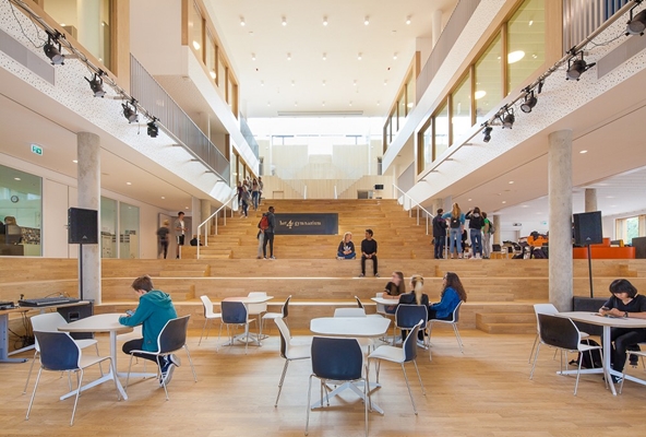 Het onderwijsgebouw is onderverdeeld in drie horizontale zones. In de plint bevinden zich de entree en het openbaar programma. Via de hoofdentree en de verdiepte fietsenstalling wordt het atrium bereikt. In het atrium ‘hangen’ verschillende leerpleinen en balkons, die via gangen verbonden zijn met de lokalen. Door het openen van een schuifpui kan het lokaal worden uitgebreid met het leerplein tot één continue landschap, leerlingen kunnen hier ook zelfstandig werken of ontspannen op de balkons. De les- en werkruimten zijn verdeeld over de eerste en tweede verdieping. De bovenste verdieping biedt ruimte aan een volwaardige sportzaal en een groot dakterras, de sportzaal wordt middels een aparte opgang ook buiten schooltijd door sportverenigingen en de buurtbewoners gebruikt.