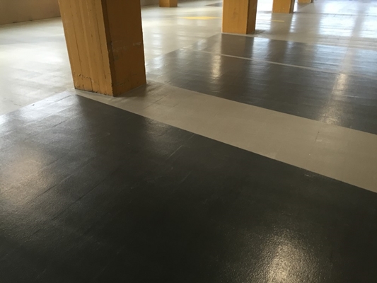 De applicateur dacht samen met Triflex ook mee over manieren om de fabriekslook te behouden op de tweede en derde verdieping van de parkeergarage. Meekelenkamp: "Op deze verdiepingen hebben we met het vloeibare Triflex CPS-C+ een duurzame antislip slijtlaag rechtstreeks aangebracht op de betontegels die er al decennialang lagen. De contouren van de oude vloer zijn nu zichtbaar in de nieuwe parkeervloer. Dat geeft een nostalgische uitstraling. Om kwalitatief niet 75 jaar terug te gaan in de tijd, zijn wel eerst de losliggende tegels vervangen."