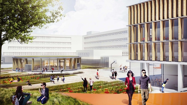 Schuin tegenover het bestaande schoolgebouw ontwerpen we de nieuwbouw. Dit gebouw staat in directe verbinding met de openbare ruimte waardoor het studenten uitnodigt om naar binnen te komen en op de campus te blijven. De connectie met de campus ontstaat met behulp van de extreem transparante, glazen gevel. Verticale houten lamellen zorgen voor een vriendelijke, warme uitstraling en beschermen het glas tegen opwarming en direct zonlicht. Daarnaast ontwerpen we themapleinen op de campus waardoor levendigheid ontstaat. Zo zorgen een cultuur-, een sport en een stadslandbouwplein ervoor dat studenten geactiveerd worden en zich betrokken voelen bij de school. Tegelijkertijd haalt het studenten naar buiten toe, het groene campusterrein op.