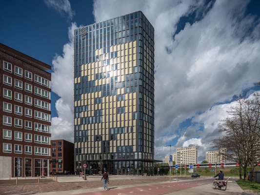 INTELLIGENTE FAÇADE Een van de meest zichtbare circulaire elementen van de ‘living building’, is de innovatieve bewegende gevel. Deze ‘intelligente façade’ bestaat uit 1638 bewegende panelen aan de buitenzijde van de ramen die, als de gast niet in de kamer is, reageren op de gewenste temperatuur in samenspel met het buitenklimaat. Zo zorgen ze voor extra isolatie op koelere dagen of laten zonlicht binnenstromen voor verwarming, zodat de kamer altijd op een aangename temperatuur blijft. Deze revolutionaire klimaatbeheersing zorgt voor minder energieverbruik voor verwarming (65%) en koeling (90%). Een gevel als deze is uniek in de wereld en zorgt er ook voor dat het gevelbeeld dynamisch is en continu verandert onder invloed van de wensen van de gast, het weer, de tijd van de dag en de tijd van het jaar. De gevel is aangesloten op het gebouwbeheerssysteem (gbs), dat geïntegreerd is met het Hotel Management Systeem. Vanuit dit systeem wordt de roomcontrolbox van informatie over installaties, het gebouw en de gasten voorzien. Technisch dienstverlener Croonwolter&dros koppelde alle hardware systemen op de roomcontrolbox. Ook hardware systemen als toegangscontrole, beveiliging, de gevelreiniging, de house keeping signalering en boekingssysteem maken hier een geïntegreerd onderdeel van uit.