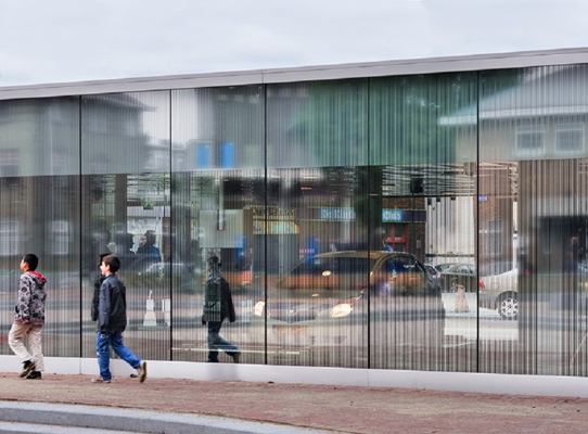 Om het gevoel van veiligheid verder te vergroten zijn de bovengrondse inrit boxen en wachtruimte in een transparant glazen minimalistisch rechthoekig volume opgenomen. De glazen gevel is bedrukt met zilverkleurige lichtreflecterende verticale strepen. De spiegelende strepen zorgen er voor dat het gebouw van binnenuit transparant is zonder dat de ruimte opwarmt door zoninstraling. Door de spiegeling ontstaat er een dynamisch architectonisch volume die een speelse interactie aan gaat met de omgeving.
