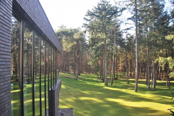Uiteindelijk werd de aanbouw zo gepositioneerd dat deze vanaf de weg amper te zien is. Pas wie de woning nadert en de tuin inloopt, ziet de extra ruimte die is gecreëerd. De aanbouw is uitgevoerd in baksteen en met veel glas, gevat in slanke aluminium kozijnen van Reynaers. Haro Aluminium was betrokken als gevelbouwer. Door het vele glas wordt het perceel van 7000m2 in een bosrijke omgeving ten volle benut.