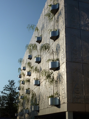 De bijzondere gevel van de garage bevat natuurlijke elementen, zoals geïntegreerde plantenbakken. Copijn tuin- en landschapsarchitecten verzorgde deze gevelbeplanting. Per gevel is gekozen voor specifieke planten afgestemd op de oriëntatie van de gevel.