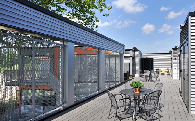 De bovenverdieping is ingedeeld in een aantal zelfstandige woonunits, compleet met dakterrassen en een gezamenlijke ruimte.