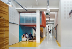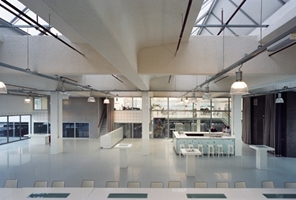 De originele fabriekshal uit 1953 bleef bewaard, latere toevoegingen werden gesloopt. Het industriële karakter blijft dus bestaan, terwijl nieuwe functies een zichtbaar afwijkende vormgeving krijgen. Ruggengraat van het gebouw is de nieuw gecreëerde brede gang als centrale ontmoetingsplek. Daaraan bevinden zich een kantine, loungeplaatsen en de centrale receptie. De laatste verleent verschillende diensten en secretariaatsfuncties. De gang verbindt de 56 units (25 m² – 240 m²). Om plaats te besparen en tegelijkertijd de ruimte open en licht te houden, zijn bovendien de vergaderruimtes als houten dozen aan de plafonds opgehangen. Deze en andere elementen blijven in de uitwerking ruw waardoor het fabriekskarakter blijft bestaan. Licht is een belangrijk verbindend element: naast de heropende bovenlichten zorgen de glazen schuifdeuren en wanden van doorschijnend Rodeca (een industrieel kunststofproduct) voor een open en homogene ruimte.
