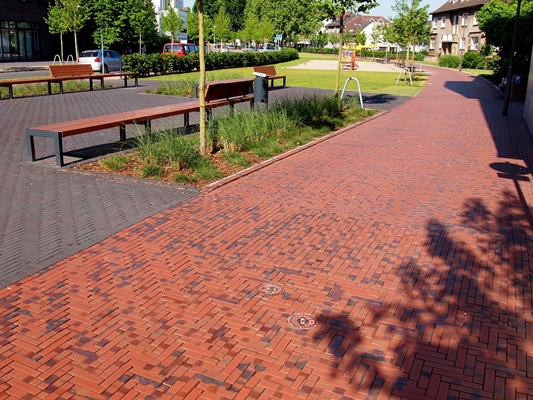 De bij circa 1.200° gebakken klinkers in het stadshart van Dinslaken verenigen de esthetiek van het natuurmateriaal klei met de technische voordelen van een bijzonder onderhoudsarme en vorstbestendige bestrating.