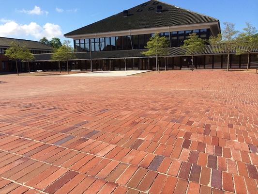 Als een topografie uit straatstenen, zo presenteert zich het „Rode Plein“ van het Herlufsholm-internaat op het Deense eiland Sjælland. Bij het 450-jarig jubileum werd een open prijsvraag uitgeschreven voor het ontwerp van een nieuw centraal schoolplein. Het Hamburgse bureau Breimann&Bruun maakte het prijswinnende golvende pleinontwerp, met straatklinkers van de Hagemeistersortering „Friesland“