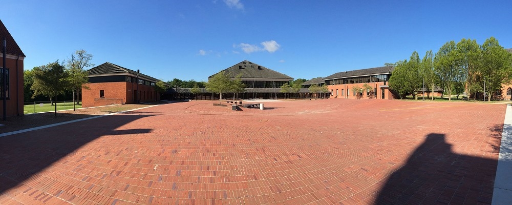 De rood-blauw-bruine Hagemeistersortering „Friesland“ weerspiegelt de kleurigheid van de gebouwen en zorgt voor een levendige pleinruimte. „Wij wilden een bewogen oppervlak en een toegankelijk en begaanbaar landschap scheppen“, aldus landschapsarchitect Bertel Bruun. Het plein bezit onder meer heuvelachtige verhogingen met banken en heeft in het midden een centrale plek voor ontmoetingen en discussies. „Het idee was om het plein als agora op te zetten, een toegankelijke plek waar leerlingen en leraren elkaar treffen, als in het oude Athene“, beschrijft Bruun.