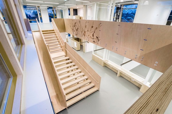 De andere trap heeft een glijbaan gekregen. Deze trap zit bij de in- en uitgang van de school zodat kinderen als ze uit zijn de glijbaan kunnen pakken! Beide trappen zijn gemaakt van berkenhout en overal is een speciale kindvriendelijke lak toegebracht. Tot slot hebben beide trappen bijzondere infrezingen gekregen.