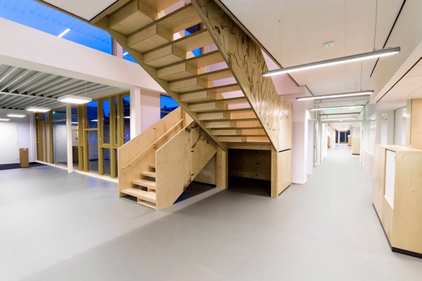 Voor een basisschool heeft Van Bruchem twee grote trappen ontworpen en geïnstalleerd, in nauwe samenwerking met NOAHH Architecten. De trappen moesten echt iets bijzonders aan het interieur toevoegen en meer bieden dan een gewone trap. Zo heeft de bordestrap boekenplanken tussen de treden gekregen en een speelhoek onder het tussenbordes.